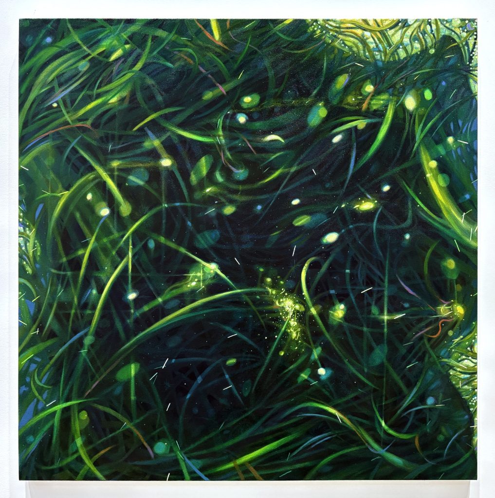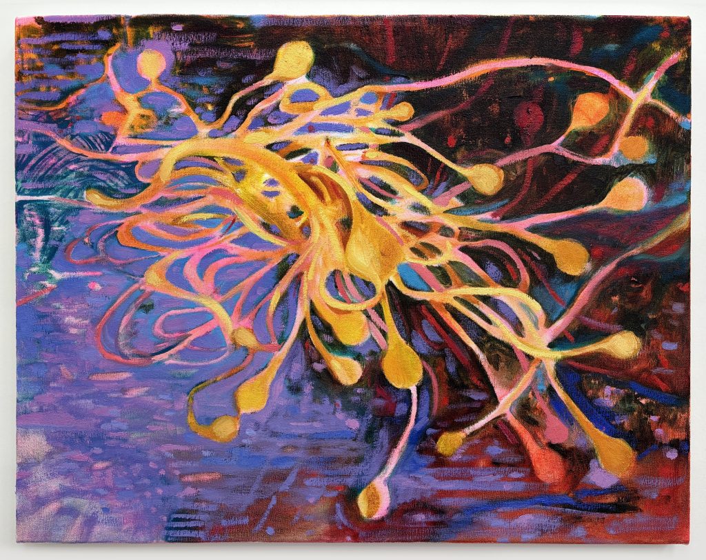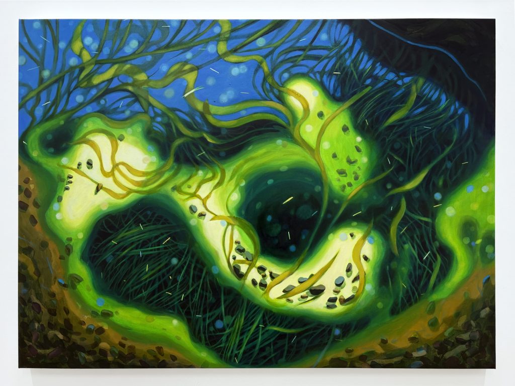 I am pulled towards using vibrant and warm colours to evoke my emotional connection to the marine ecosystems of the Pacific Northwest. I use thin glazes paired with impasto brushstrokes to achieve a sense of visual depth and fluidity, like looking into a deep well, thus subverting traditional notions of landscape painting. This aquatic thinking is informed by my fieldwork in intertidal zones in BC.