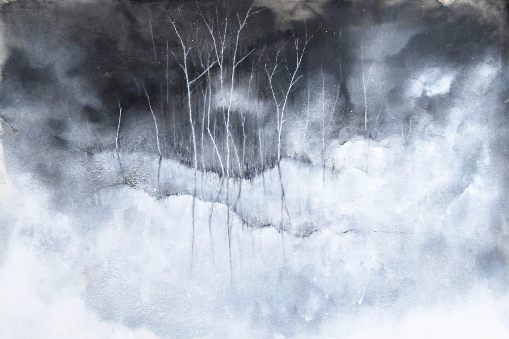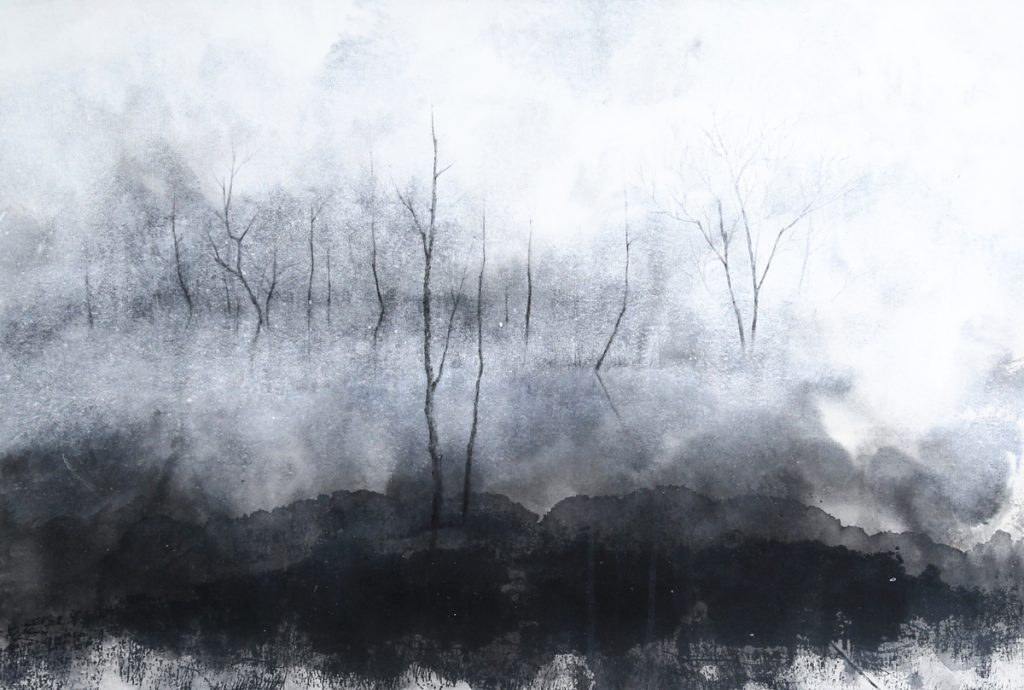 「雷激山水」系列的创作灵感,来自我在温哥华太平洋精神公园(Pacific Spirit Regional Park)森林中所看见的雷击木。当我第一次凝视那些曾遭雷击的老树时,树干上留下的裂痕、炭化的纹理以及岁月沉积的痕迹,深深触动了我。那并不只是自然受创后的表面,而是一种自然力量留下的深刻印记,也成为我重新观看山水的起点。